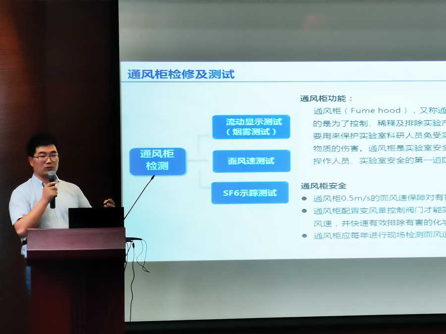 培训开始,姚院长首先针对近期全国高校实验室安全管理现状进行了简要总结,强调了加强实验室安全管理的重要性与紧迫性。随后,上海埃松技术总监夏本明先生分别从高校实验室现状、实验室通风柜及其他通风安全设备的原理与设计、通风橱及气瓶的安全使用与注意事项、仪器试剂的安全使用与存放、危化品的管理与处理、用电用水及使用习惯等多个方面与现场师生做了解读与分享,配合各种事故案例与实验室安全操作警示片等方式强调了实验室安全操作的重要性及不良处理的后果。引导学生养成良好的安全习惯,关注实验室安全、认知危险、增强自我保护意识和安全意识,学会避开实验不合理操作带来的危害,倡导师生共同创建安全、和谐的实验室环境。