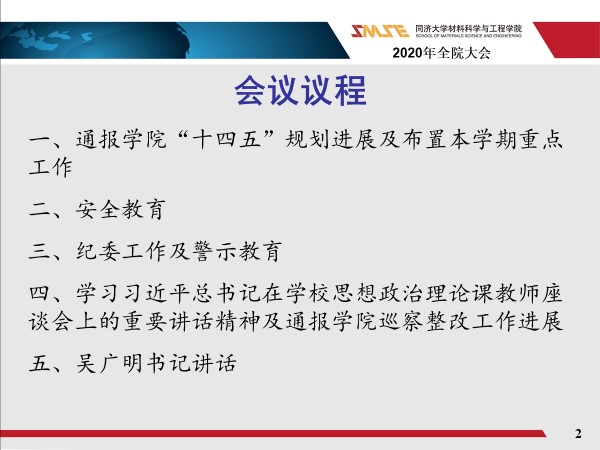 接着,黄老师布置了本学期重点工作。教学方面:在确保完成教学工作的前提下,专业建设向前迈进。同时,启动一流本科专业建设“双万计划”的要求,完成材料科学与工程专业2020年国家一流本科专业建设的申报工作。完善研究生招生及培养,加强本科专业宣传及吸引力,吸引更多的学生选择材料学院。学科及科研工作重点:根据教育部安排,完成第五轮学科评估工作;做好一流学科建设验收工作,认真总结建设经验与不足,为下一轮学科建设做好谋划;积极筹划和参加学校规划的“储能科学与技术”学科和专业建设;组织2021年省市级科技奖项申报,力争一等奖的突破;做好本年度重要科研及人才项目的申报工作;2021年国家自然科学基金动员;继续推进落实ESI计划;发挥学院师生积极性,结合校友和社会资源,做好社会服务工作。行政和实验室工作重点:测试中心大型仪器设备预约和信息共享平台建设的验收、培训并开放运行;德才楼实验室通风系统升级改造工程;嘉定校区管控危险化学品仓库建设验收、并投入运行,教辅岗位招聘;实验室安全管理治理结构优化和长效机制建设;科研——自修空间调整;学院固定资产盘点;学院专业实验室搬迁及实验教学示范中心建设方案规划;基础研究公共平台(分析测试中心)建设方案规划。学生重点工作:丝毫不放松疫情防控工作;开展爱国主义教育,迎接建党百年;提高入党申请比例,完善基层党建;开展心理健康教育,完善工作队伍建设;深入三全育人综合改革试点工作:社区思政+实践+创新。