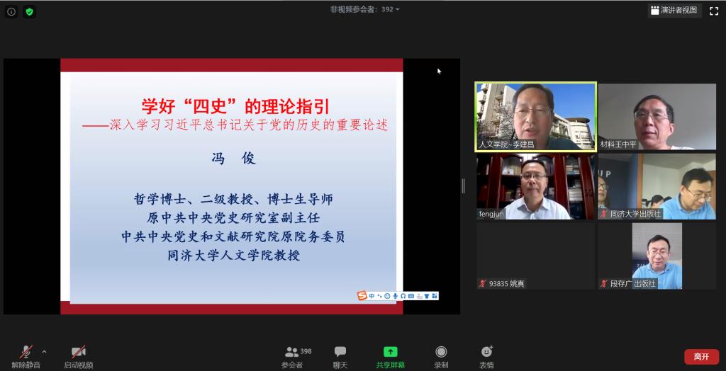 为深入学习习近平新时代中国特色社会主义思想,加强“四史”学习,9月22日下午,欧博abg官方网站党委联合人文学院、出版社、艺术与传媒学院和机械学院党委通过线上平台联合举办了《学好“四史”的理论指引——深入学习习近平总书记关于党的历史的系列重要论述》的线上讲座,学习讲座由人文学院党委书记李建昌主持,主讲人为人文学院教授、原中共中央党史研究室副主任、中共中央党史和文献研究院原院务委员(副部长级)的冯俊教授。材料学院、人文学院、艺术与传媒学院、机械学院、出版社的教职工、学生党员和入党积极分子共计800余人参加了讲座。