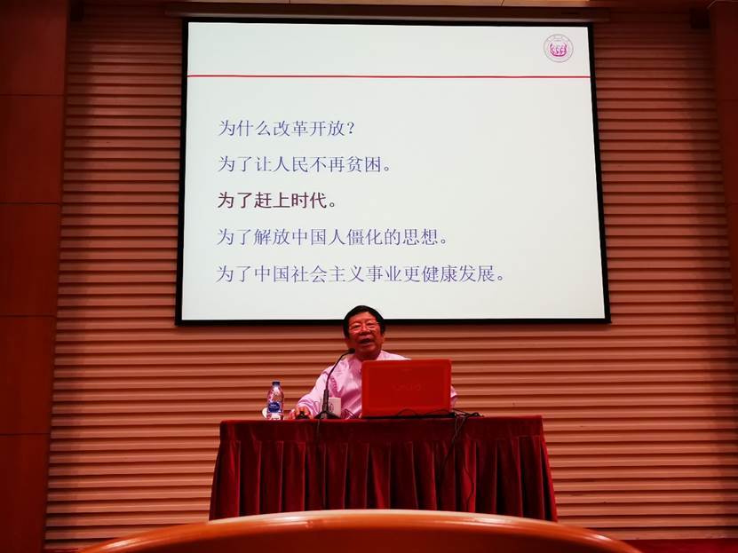 李教授用生动的语言给我们带来了一场精彩的党课,向我们讲述了改革开放前的一些大事,比如社会主义道路探索、大跃进和人民公社等事情。让我们明白了改革开放的必要性和重要性。特别是小岗村这个例子,讲村民是如何想到分产到户,到到分产到户过程是怎样一步步被听取到中央,就在这个过程中体现了改革开放的突破禁锢,解放思想。李教授的讲述十分生动,会议厅里不时发出阵阵的欢笑,也在这种欢乐的氛围里,让我们感受到了改革开放的必要性。