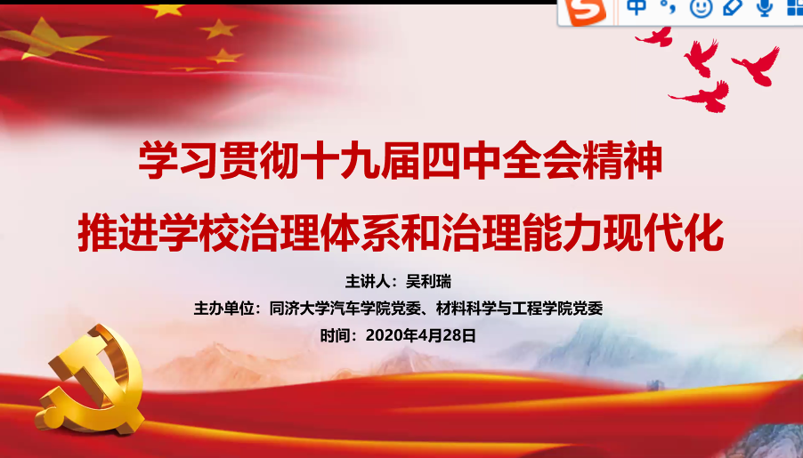 4月28日中午,欧博官网党委组织全院教职工政治理论学习,邀请校纪委副书记、监察处处长、巡察办主任吴利瑞做题为“学习贯彻十九届四中全会精神,推进学校治理体系和治理能力现代化”专题讲座,欧博官网党政领导班子及全教职工130余人通过网络会议平台聆听了报告。吴利瑞书记首先向学院教师传达了十九届四中全会会议精神,从会议的主题及主要成果、七十年创造的奇迹、13个坚持和完善等方面一一展开阐述,并结合自...